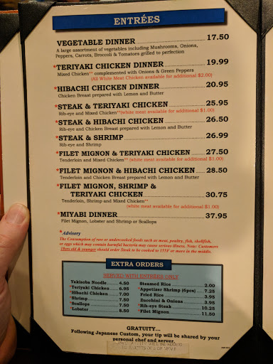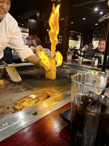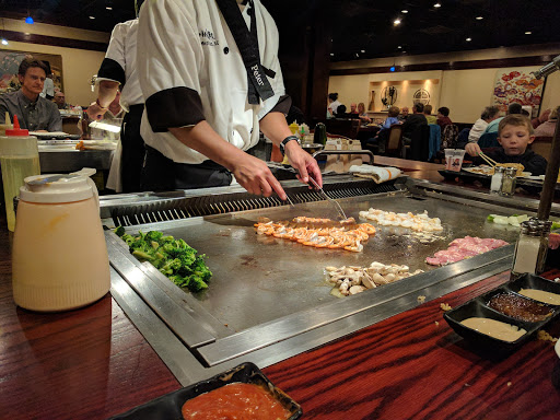 This place was great. Im no connoisseur of Japanese cuisine, but this was your typical Japanese steakhouse where they cook the food on the table and bang the knives and stuff on the table and try to entertain you with bad jokes. The food was good. Portions were generous. We went at 6:00 p.m. on a weekday and had only a minimal wait. (Cant comment on the sushi bar.) Service was good. We shared an entree (chicken, shrimp and steak) and it was a good plenty for 2 people. (They charge $8.50 for sharing, but its actually reasonable as you still get the salad, soup and rice.)