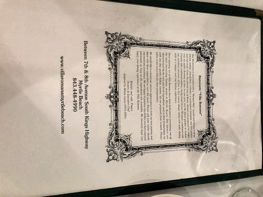 I went to Villa Romana with a group of girls for a bachelorette party on a Saturday night. We were hesitant seeing the outside of the building and the sign, but all reservations went away once we sat down. We had a phenomenal server and couldnt believe the amount of food that came with the meal. The bruschetta was probably the best Ive had, and my entree - Chicken Fiorentina - blew me away. Plus, the homemade soup was unique and delicious. All in all, probably the most authentic Italian food Ive had. We also received lots of food on the house - an antipasti platter (sooo good) and several desserts, along with a bunch of complementary alcoholic beverages, including a carafe of wine and house-made limoncello. We never had to ask for anything - it was always there before you could think to ask, even refills on water. Plus, the accordion player was entertaining and very skilled, which added a lot to the atmosphere! The whole group was very impressed and well all be going back every time we visit Myrtle Beach. I highly recommend it!!