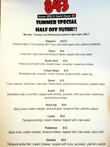 I lived in Korea for years and am a huge food lover who knows Korean cuisine well. Unfortunately, 843 was a big disappointment. I spent over $70 on alleged Korean BBQ and experienced the following: 1. Pahn chahn (traditional Korean side dishes) were few in number. What did come out was just not good. The kimchi, which is always the litmus test, was dry—something Ive never experienced before. The "fresh" peppers had obviously been cut hours prior and had completely dried out. Pickled radish was flavorless. 2. I ordered sahm gyup sahl, my old favorite style of pork, and it came out sliced way too thickly and with a heavy preponderance of fat. 3. The signature Kalbi was virtually flavorless. The samjang and marinated onion were given in such small quantities they were gone almost immediately. The lettuce (sahngchu) was all spine and cut way too small to wrap around even the smallest piece of meat. The owners seem intent on providing offensively stingy portions, pre-preparing almost everything at the expense of freshness and quality, and grossly overcharging—essentially preying on ignorant clientele. Most of the interesting items (budae chigae, kalbi tahng, nangmyun, etc.) have already disappeared from the menu, leaving customers with the same old American-friendly fare. I would happily pay $70-80 for an authentic, fresh, quality Korean meal; unfortunately, 843 fails to deliver on all counts and I left feeling ripped off.