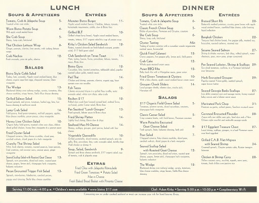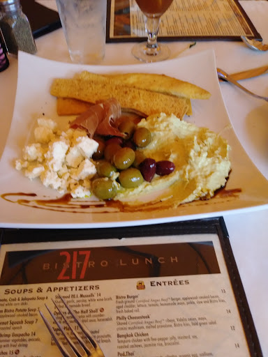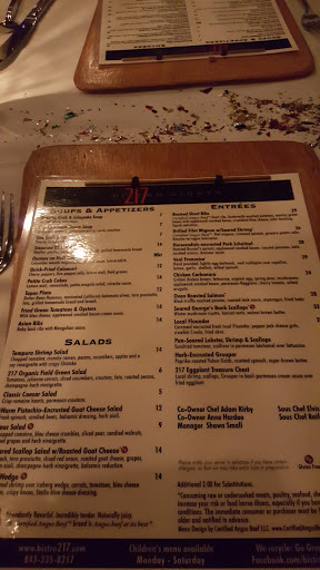 I visit this establishment once a year during my family vacation and its always our first stop after a long seven hour drive, and for good reason. The hostess, wait staff, and bartender are always friendly and professional, but the real test of any restaurant is the food, and Bistro 217 deserves its A. Not only is the lunch and dinner menu diverse enough to satisy anyones craving for grill and/or seafood, its always delivered fresh and relatively quickly (and Im always with a group of 17 people).