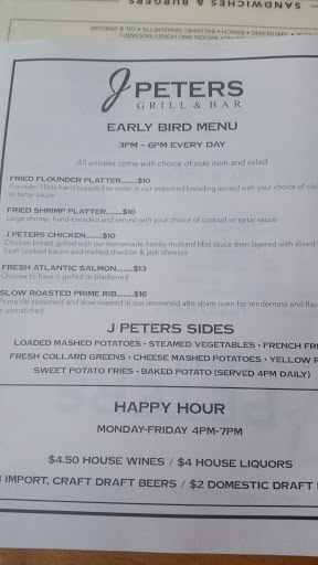 I was always a big fan of prime ribs. When living in New York My favorite restaurant was the Old Homestead on 14th street and 9th avenue, where for about $45 they gave you a hunk of meat, , about 3-inches thick, on the bone, that was absolutely delicious. Now retired, and having moved to Pawleys Island, my pocket book, nor my stomach, can handle that size,. And then I found J Peters and their early bird special. A wonderful salad, followed by a good size slice of prime rib, both delicious and cooked to my liking (rare), coupled with a stuffed potato and all for $14 on their daily early bird specials made J Peters my favorite spot locally. They have wonderful lunches, and a full /lunch dinner menu, but I strongly suggest the early bird, served from 3-6 daily and a choice of prime ribs, cooked the way you like it, will make J Peters a frequent spot on your restaurant list.