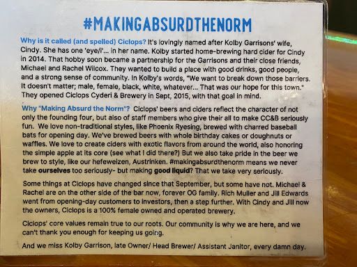 $8.00 5 - 4oz flights everyday Open: Tuesday thru Saturday Contemporary industrial interior including comfortable lounge, outdoor pergola, window seating overlooking the Chapman Cultural Center and much more. 30 Taps, including local and regional selections. Wine, light fair and craft retail selection from around the world. Home to Ciclops Cyderi and Brewery which will unveil its first selections starting Oct. 2nd 2015.