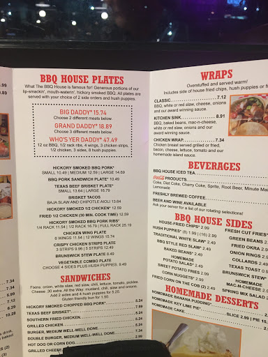 We had a terrific experience last night at the Bar-B-Que House. The inside reminds me of a nicer fast food place. You seat yourself, which is always nice having a choice of tables. Our waitress, Alice, was at our table within a minute to take our drink order. We also got our drinks within a minute and gave her our order. The food was amazing. Every order comes with a side of hushpuppies and most come with two sides. I got wings and ribs, (a great and unusual combination ha ha), and my wife got pulled pork. All the meat was super tender and fell off the bone. The wings were some of the best Ive had. But, we really loved the sides. The mac and cheese was incredible and the hushpuppies were outstanding. Plus the prices were reasonable. For four of us to eat there, it cost 50 dollars. Thats 12.50 a person! Awesome place.