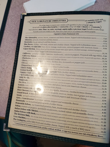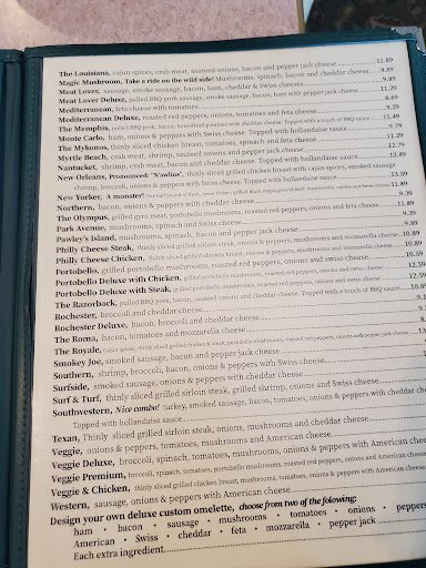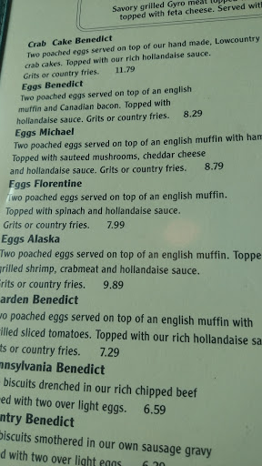 The food is outstanding and the service is excellent! Prices are excellent. They serve both breakfast and lunch items all day and also have a childrens menu which is appropriately priced and portioned. They have 71 omelets to choose from and if you just dont see one that you think appeals to you, you have the option of just building your own! Our food came out quickly and was delicious. I will definitely return next time Im in the area! The servers are all so friendly and very knowledgeable about the area! What a nice touch to have employees that are also local and familiar to the area and can suggest the best places to go and things to do while in vacation! Cant wait to visit next year!