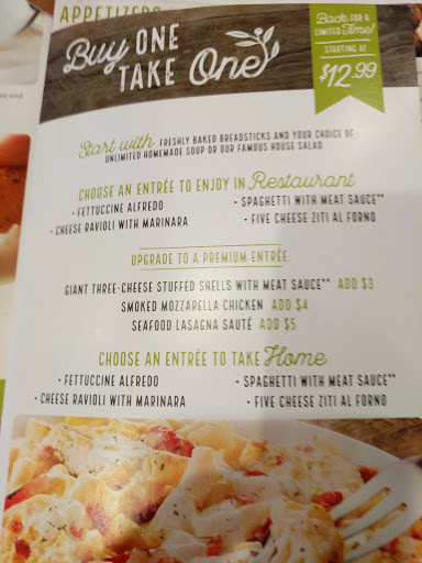 Severely understaffed so that the lobby is full but half of the restaurant is being used to seat people. Bar area always seems to be full because its immediate seating. Was seated at a booth with dirty used wine glasses with the previous tables wine . Food was messily placed on the plate in poor presentation with smaller than usual portions than other Olive Gardens in the Nashville/Brentwoood areas - clearly a shoddy kitchen and wait staff. Ordered a seasonal special lobster ravioli with steak and shrimp. Unfortunately they dumped 1/4 cup of the water they cooked the shrimp in on my plate so my underseasoned steak tasted like shrimp and the ravioli had no cream sauce on it and it was dissolved. Disgusting. The server was embarrssed and said it would take too long to fire up a new plate and if I just wanted to keep what I got, wtf?! Never going here until they can properly staff that place. Never a great sign when the floor manager is sweating like a pig teying to bus tables.