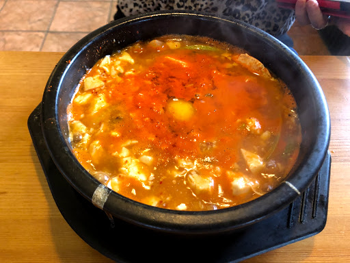 I enjoyed this restaurant. From the outside, it doesnt look like much, but on the inside.. It was pristine and the inside was decorated artfully. The dining space feels open, and there are small plants in cute vases in the windows. It had a crisp black/white paint design, but it was friendly. My daughter said she wanted to live there. The food is a spot expensive, but fairly good. The tofu soup was spicy and fresh, but lacked some elements of prior experiences (vegetables were sparse, and the seafood inside left much to be desired; freeze-dried clam and shrimp, one each, and a snippet of baby octopus tentacle). The tofu was a bit bland, my daughter thought, but she didnt order it and I liked it. The bean sprouts were excellent, as was the Kimchi. From a service standpoint, it was different, in a good way. You order at the front, and the cashier was extraordinarily pleasant, and sit down. She brought us our dinner, and we cleared the table after (they have bins for the dishes like a fast food place might). I rather liked the setup. Overall, I would eat here again.