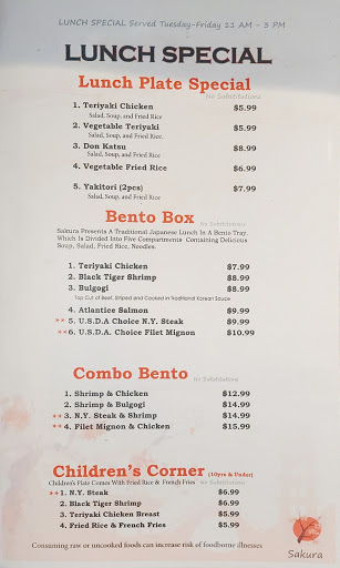 My husband and I are hard core Hananoki fans dedicated customers to their hibachi grill... were. We were. We have a date night at least once a month, a time to get away from the kids and take time just for us. Generally we go to Hananoki every time, but this time my husband asked if I wanted to try Sakura. Sure, why not... if it is terrible we learned a lesson, if it is okay, well - its closer to home. What. a. shock. When we pulled in, it was a bit lackluster outside, and there were not many cars in the parking lot. Inside was very homey, kinda dark, and you could hear the radio playing. There was one table of people... I was skeptical. The napkins were folded up like origami with the fork and chopsticks, on this pretty plate (that looked like it was shipped straight from Japan). Everything was very clean and organized. The waitress was very nice and she sat us at our grill table, and we waited. That was a big plus - the ladies at Hananoki always seem to try to be rushing people in and out, and if the table cant be filled right then - you have to wait in the lobby area. She brought us our drinks (which the "Adios Motherfu*ker" is AMAZING by the way) and we waited patiently and looked at the sushi menu - amazing sushi at a great price. Another couple came in and she sat them with us and a few minutes later ( maybe 10 minutes after sitting down) she took everyones orders. The soup was great - you can tell they use the bones of the animal in the stock (or something of the sorts) since it was so flavorful... I was not a fan of the salad dressing but my husband loved it. They cleared our table as soon as we were finished with each thing and then we waited maybe MAYBE 5 minutes for the chef to come out. It was so amusing. There was a child at our table with the other couple and he made sure she had a blast. He was friendly, funny, and engaging and made the whole experience really fun. He had us all laughing from start to finish... even when he was cleaning the grill it was entertaining! The rice, which we did not pay extra to have fried rice - was so yummy and he even added sriracha for the guys. ALL the food was yummy... especially the weird spaghetti noodle and sweet potato thing... not really sure what it was called but it was so good. (I ate half my husbands too haha) I was full before all the food was on my plate... There was SO much food. Dinner was even finished with ice cream. And we were not rushed out the door... They told us to stay as long as we wanted to. All in all, like any hibachi grill, it is going to be a bit pricey, its entertainment and dinner. But let me tell you all what - my husband and I both got 2 drinks each, plus a sweet tea, a full dinner (like 3 meats; I got chicken, shrimp, and steak (which was cooked PERFECT) and my husband got chicken, shrimp, and scallops) and a huge sushi platter... for around $80. We always leave Hananoki spending well over $150 and never have that much left over. Good job to Sakura - if you are wanting yummy food and a good show at a damn good price, try this place. You shouldnt be disappointed.