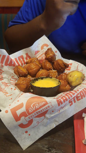 I am Jim. Went for new Jim beam burger Free with the promotion. Burger overdone, not alot of taste. When we went it the place wasnt busy. Took 30 min for our food. After we were through took 15 min to get our bill. I have been to red robins in other areas and the food and service was much better. Our bill was OK with the free burger, but prices are steep for what we got. almost 10 bucks for a burger and fries?