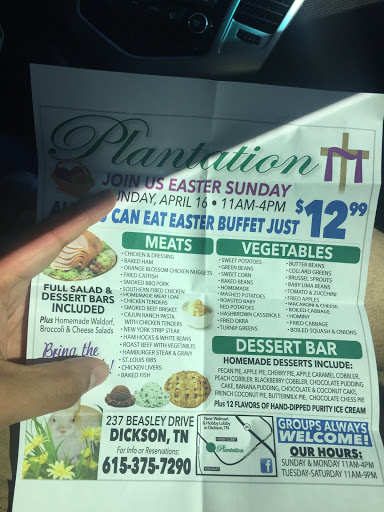 The Plantation is "southern cooking" buffet-style restaurant (what Shoneys lunch and dinner should be...) that has a "very rustic" and "home-y" feeling. While I cant say how the Plantation compares to Dales Steakhouse since I havent been there but I hear the price point is pretty good in comparison (Dales Steakhouse at one point boasted of "an all you can eat seafood & steak" nights at around $45-50 a person and my last Sunday lunch total at The Plantation was about $26 for two people) but "on par" when compared to other buffets near by like Mings Court and possibly Sisters Restaurant. I havent been to Sisters (another Southern soul food establishment) so I also cant compare it as well (unfortunately) but I can say for damn sure that The Plantation is about THREE steps above the now defunct "Farmers Restaurant" and maybe one step below Cracker Barrel. I guess the major difference... other than the fact that Cracker Barrel is an established chain restaurant and The Plantation Restaurant isnt is that the latter is a buffet so youll obviously get more for your dollar while the former is of better quality. For perspective, The Plantation Restaurants food tastes like your "grandmother" cooked it, which helps add to the homey feeling of the restaurant; Cracker Barrels food would be like if "Martha Stewart" and "Paula Deen" were your aunt and grandmother and "they cooked it". In retrospect, thinking about The Plantation Restaurant, one might say that the interior décor seems reminiscent of Cracker Barrel (see my photos) but I would argue thats not the case. The Plantation has its own rustic and harvest inspired atmosphere and I think it works well for it. The staff is friendly and only one particular time did we have an "absent waitress" and that was because she was actually really busy so that is easily forgiven. Since I have written about the food quality, staff, and atmosphere, Ill go ahead and address the "elephant in the room". The name "Plantation" conjures up feelings of deep sentiments (on both "sides") and Ill admit that I fell prey to such thinking and Im not afraid to say that as an African-American, there is none of that "nonsense" there. There isnt anything to suggest that it would have that type of atmosphere; There arent any "humble" house workers and the Virgina Minstrels arent performing "slave melodies" so dont be afraid. As "a matter of fact" the only "slaves" there are the capitalists "wage slaves" so be please tip those hard working people more than 2%, we tip 10%; maybe we all should....