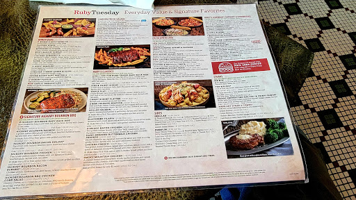 The salad bar is the main draw at Ruby Tuesday. Always fresh and the croutons are made fresh instead of coming out of a bag. The mashed potatoes are very very good as well as the ribs. My only complaints - if I go alone, I have to insist on getting a good table and they dont have bread with every entree. Otherwise, its a great place to eat. Coupons are a good deal and you can have them emailed to you - no need to print, just show the server right on your phone.