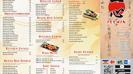 Everyone is very friendly. The sushi and hibachi are both amazing. Try the Isshin roll! The hibachi is definitely the best around! Great portions. I can never finish all of it. The only downside is they are closed between 3-4:30p, which, for some reason, is when we usually decide we want it.