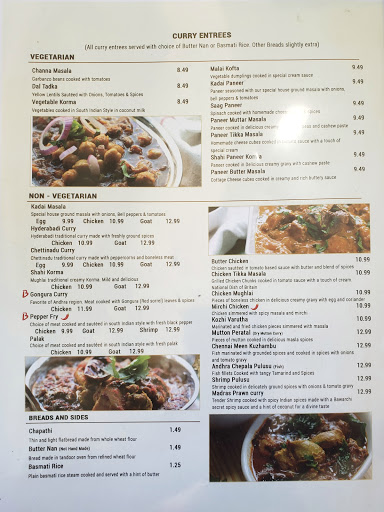 I really enjoyed it here. They have a large menu with many of my favorites. When I asked for recommendations, the lady at the counter was quick to recommend and describe a few of the entrees and ask questions about my preferences for meat and spice. I ordered the Chicken Tikka Masada and the food came out within 15 minutes. It was hit, fresh and very tasty. Ill definitely be coming back here. My only wish was for a menu that was easier to read (its a screen behind the counter).