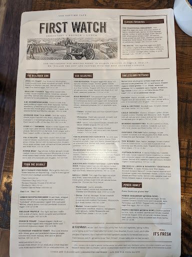 Food is good. The service was awful and our waitress was not personable or even courteous. She walked up to the table and without even looking at us asked, "What do you want?" We waited FOREVER and the seating was freezing. I was disappointed I typically love First Watch but this was just not a good experience.