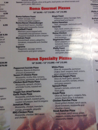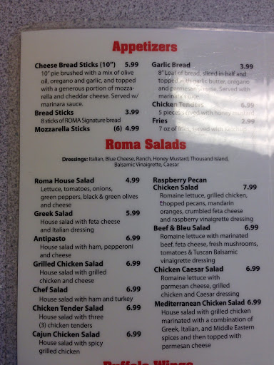 Being disabled, I dont always feel well enough to cook dinner for my family, and Romas is one of our favorite places to order dinner from! Their pasta dinners, pizza, and calzones are out of this world, and their salads are fantastic. Theyve changed ownership recently, and the new owners and staff are very friendly and happy to accommodate special requests, like adding extra toppings on their fruit and nut salad, which is my daughters favorite. My favorite is their lemon pepper wings, and their manicotti, and their Greek salad, and...well, everything is awesome!
