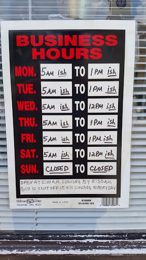 | Working: | 5AM–1PM 5AM–1PM 5AM–12PM 5AM–1PM 5AM–1PM 5AM–12PM Closed |