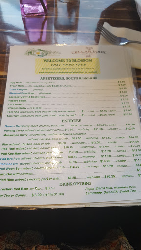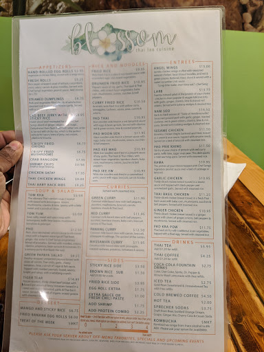 So happy we now have Thai in 37075!! I ordered the Green Curry today and it was an epicurean delight! That sweet, green, savory sauce has just the right amount of heat. Best Ive had since I left CA. We also ordered Pad Thai, and that was pure bliss! Medium hot was plenty spicy. The noodles were perfect. We got beef Pad, but you can order most of their entrees with shrimp, beef, chicken, pork or tofu. Or you can ask for all the proteins combined in a "combo"! Welcome, Blossom! Im looking forward to working my way through all your dishes.