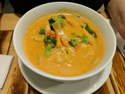 So glad that there is such a great tasting Thai place closer to home. Had the Pad kee Mao with tofu and it was excellent. I did notice chicken (small pieces) mixed in the noodles, not sure if this is due to the fact they cooked my order with the chicken one I ordered. So if you want vegan, you may want to specify, I am not vegan just trying to eat less meat. Great local beer selection. It is a bit over priced for the portion you get, but I will definitely pay it again. Sat at the bar and ordered take out on a Wednesday night and it wasnt crowded.