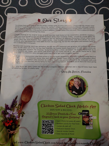 The chicken salad is very good and service is fast and friendly. There arent a lot of options other than chicken salad, so if youre not in the mood for chicken salad, Id recommend a different restaurant. There are many options close by. It can get crowded at lunch. There are also other stores nearby if you have any shopping to do.
