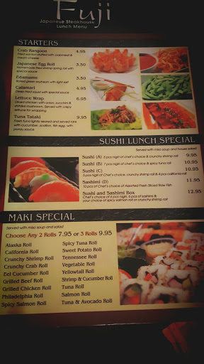 Sushi was horrible. Rainbow roll...I was shocked how it was made. Pretty much whole lot of things was missing from the roll and the Sashimi was horrible too. I dont recommend people to go here to eat. These are the best sushi restaurants Sapporo and Kabuto in Goodlettsville, TN. Fuji in Hensersonsville, TN. needs to be shut down.