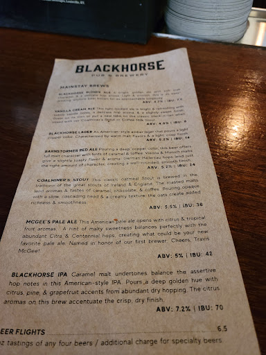 My wife and call the black horse Pub & Brewery "the pub" due to its location and our frequency of visitation. Weve always had decent service and the food is well above average. The beers are probably average. However , they have some exceptional outliers that are well worth the visit. The Imperial Red is amazing and probably the best craft beer produced in Knoxville. Great location for large groups that dont require a privet room. Food menu is diverse enough for all tastes. They have a large bar area with several big screen TVs.