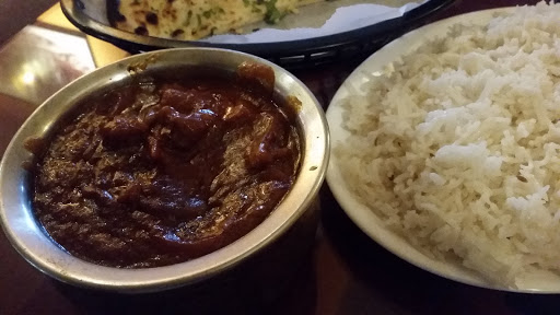 Flying Horse lager for the table, good company, and a charismatic server set a good scene for our dinner. The app was some tika sampler, and wasnt very good. Dry chicken and freezer burned shrimp. Fortunately, the "chat" I ordered as a backup app was amazing. Sadly, I dont recall which one I ordered. We had Rogan josh and palak gosht, and while both were good, I loved the palak gosht. Nan bread was pretty good as well. Desert was (if I recall correctly) Gulab Jamun; fried goat cheese balls in honey. Holy crap so good. Well definitely be back for dinner again. Two things; take the advice of the server if youre not knowledgeable/comfortable with the menu, and dont order anything that doesnt come in some sort of sauce ("wet" dishes). They dry ones are very dry.