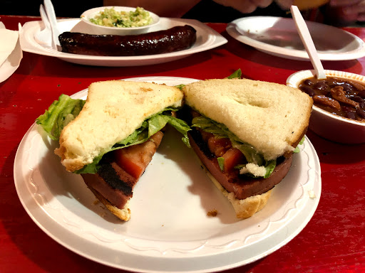The food made me and my son sick. We both got a type of food poison and spent the whole day in the bathroom and in bed. If you were here on 11/25/14 and also got sick, please reach out to me. Overall the food is terrible, everything the sell, you can tell was not fresh or prepared there. All probably bought at the grocery store. Like other reviewer wrote, "this place is a typical tourist trap". Food is really expensive for what it delivers, and the false advertisement "the best ribs I ate"....So misleading... Plastic plates, plastic silverware...The taste of the BBQ was horrible. If you think that this food is good, you never experienced any good food in your life and should be pretty sad about that. We ended up staying as we were too nice to leave. I will never do that, in the future, I will step into a place that I do not like, I will stand up and leave. Do not go to this place, you may get sick.