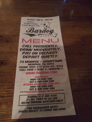 Ive always loved Bardog. The food is great, Aldo (owns Aldos pizzas and Slider Inn) knows how to make a good place with a great menu. I get take out from there sometimes and Im always happy. Late hours, compared to the rest of Downtown, and the guys know what theyre doing. For those that complain about smoking: 1) Bardog is NOT the only place that always smoking indoors, most of Beale Street and a couple of other bars of Main allow it too but 2) what those dont offer, that Bardog does, is a downstairs non-smoking area that is quite lovely. Everything that Ive had there, and at Aldos, is amazing. You cant go wrong with anything! The staff there is awesome too, Aldo knows how to run his business well.