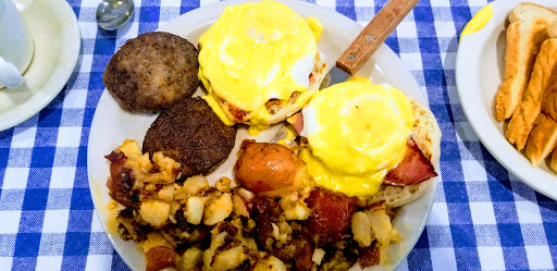 Great service and a good location for traveling in Memphis. We had the eggs benedict, which came with biscuits and gravy, with pancakes and a side of bacon. That was about $14, and it was like an all you can eat platter--plenty for two people. We didnt even finish the pancakes! Very good, and very good portions.