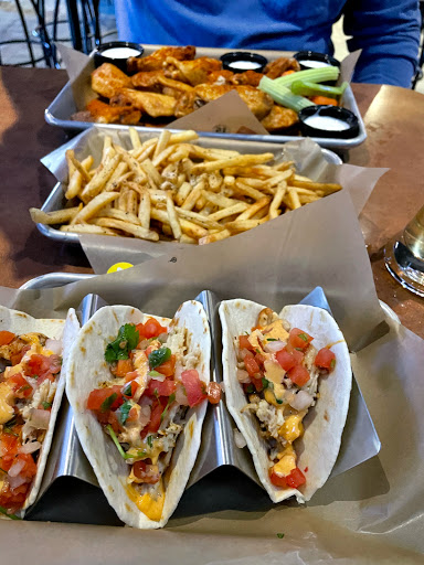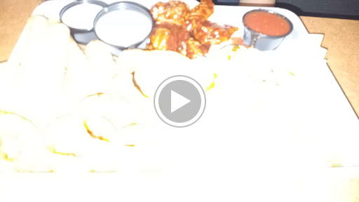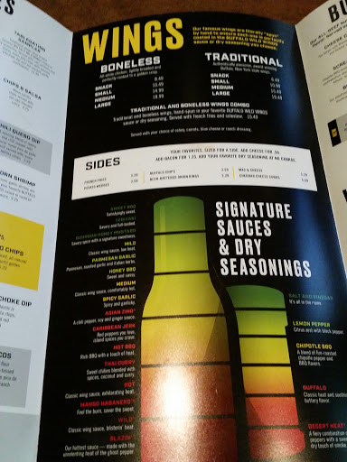 Food is average Buffalo Wild Wings fare which is not the best food youve ever had but good bar food. The location has plenty of sports games on there many mounted TVs which is the norm for this chain. All in all, I have liked my experiences at Buffalo Wild wings so this review does not reflect the chain as a whole. The staff at this chain is pretty awful (at least the waitress that I got in the beginning). From the time, we sat until we got water was 10 minutes (which is was fine). However, when we were seated the waitress made a point to tell us that because they had a big group in the restaurant she would serve us even though we were not technically her section (this came off very catty and not really our fault as we were seated at this table by the hostess). We didnt see her again for another hour (She spent the rest of that hour either talking with co-workers or running to one of the POS terminals located around the bar staying far away from our table). In the end, I flagged down another server so we could order (there were approximately 11 waitstaff on at this particular time Saturday 1PM and the place wasnt crazy crowded I could have understood if there was a big sports game on but there wasnt). The new waiter gave us 2 sodas for free which was a nice gesture as at this time most of the people we had been seated at the same time as had their food and were finishing. He tried to pick up from where his co-worker had failed so I made sure to tip him well. This could have just been this one waiter and bad luck but thats how our experience went. The total lunch took approximately 1:45 minutes and we ate in approximately 20 minutes. Also, the waitress did eventually come back to our table but only after 8 more minutes had passed and we had already ordered with the new server.