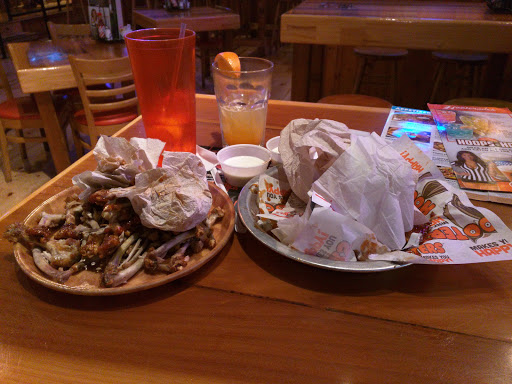 Was thoroughly unpleasant with the customer service here. The host had an attitude immediately, choosing to flirt with bar patrons instead of trying to seat our party. The fastest thing they did was give us our to go boxes and take our money. Other than that, I really like the cosmetic look. The food wasnt all that great, they were out of prewrapped bacon wings, burnt buns, and more than a half hour wait to get our food. I wont be visiting this Hooters again any time soon.