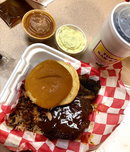 When I lived in Midtown Memphis in the late 90s-early 2000s (Hai Cooper-Young!) This was my favorite place to stop for pork shoulder barbecue. I would get a Jumbo Combo, with beans and fries for $5.25. If I recall correctly you could also choose potato salad or slaw with your combo, but I liked the beans since they would toss in bits of cooked shoulder in too. Memphis style shoulder sandwiches include slaw on them, so be forewarned if you hate cole slaw. No idea if thats done anywhere else. I like their barbecue sauce. It has a vinegar tang to it and is not hot or overly spicy. I recall making sure to order extra. I wish it was available online or something. Parking is behind the store, in a small lot. Expect lunch and dinner rushes if you are in a huge hurry, but even when there were folks waiting in the lobby the ladies there would get me out of there in 10 minutes at most. There is plenty of eat in dining if you like, but I would just motor back to my place, eating french fries in my car. Tops does catering too, and I would use this store over any in town for the basic shoulder sandwich. Corkys shoulder is bland compared to Tops, and Germantown Commissary restaruants sandwiches are smoky and tasty, but very overpriced. Tops does a top notch job at an excellent price. I had tried some of the other locations around town, but this was THE one I went to time and again. I really need to make it back to Memphis and I might make this in the top two or three stops... If you are curious, just give in and go. Its not perfect. But it was so good.