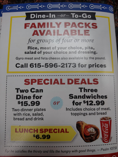My son and I have been eating here for years! Even though we have relocated to Kansas City, we still faithfully make the trip to Murfreesboro when in Nashville for these amazing Gyros!