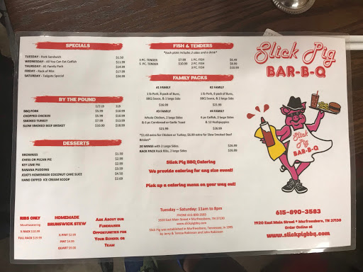 I lived in Murfreesboro for 12 years and have been going to Slick Pig fairly often until now. Im just fed up. The BBQ here is not good. Its never been good. Ive always gone to get the smoked wings. However, they started buying inferior wings that are about half the size of the ones they used to use. So basically you get less food for the same price. This is a trend at Slick Pig. Their big promotion is that they have 99 cent BBQ sandwiches on Tuesdays. Its a joke because its not their regular BBQ sandwich, its more of a slider with a tablespoon of their crappy BBQ. Dont be fooled. When they started serving catfish I tried it and it was honestly some of my favorite catfish ever. I just had it today and it was a shadow of what they started with. Inferior product, different breading, terrible. No consistency whatsoever, Im done with that place. TL;DR: Ever decreasing portions, constantly reducing food quality, extremely unfriendly staff, terrible BBQ, why did I ever eat here and/or keep trying?