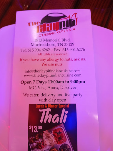 I was a student at MTSU from 2006 - 2008 and was first introduced to Indian food by trying out this place. I became a Clay Pit regular in 2007. After moving away from Murfreesboro, I have tried out other Indian food places in Tennessee and this place has the best Indian food I have tasted. Most buffets compromise food quality; in my opinion, Clay Pit does not. Clay Pit has excellent service. Note: Their all-you-can-eat buffet is not self-service; instead it is cafeteria style.