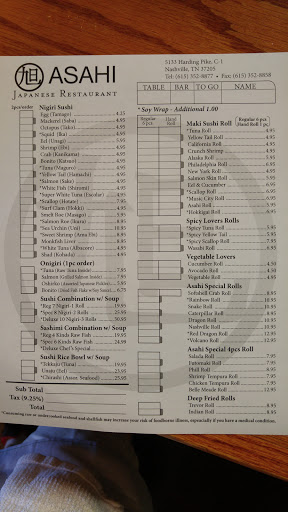 We have been visiting Asahi for years and it is our favorite around Nashville. It is usually not too crowded, so we can get in and dont have to wait forever to eat. There is only one sushi chef, the owner. He takes pride in his work and is a really nice guy. He remembers customers and always greets them when they walk in the door. We love the spicy scallop and volcano rolls. It isnt overly priced or pretentious, which is another reason we like it. Good sushi at a reasonable price-what more can you ask for? Give it a try-you will be glad you did.