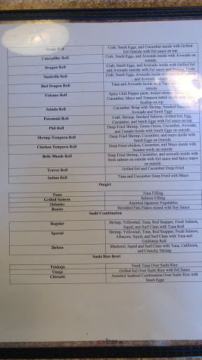 Sushi is good, the salada roll is amazing and fancy, belle meade roll, dragon and rainbow is my favorite. Highly recommended for the sushi lover.