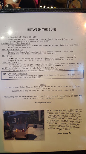 After wondering around downtown Nashville for a bit and checking out some of the sights we decided that we should probably eat. We checked out Yelp as well as Google Maps and was able to find B.A.D. We really didnt want to spend a ton of money on dinner - but we didnt want something like McDonalds so we felt this was a good compromise as the prices were reasonable. We wondered around for a bit before we actually found this location - as they literally are down an alleyway. We walked in and found a seat. They were not busy - but they were not slow either. It was a good mix. Our server came over right away and took our drink order. They did seem to be more of a bar than a restaurant but that is besides the point. They listed out all their specials and unfortunately on Friday nights the only special is $4 fireball shots. We ordered chips as the appetizer. They make them in house and are amazing. They are cooked and salted to perfection! We ended up doing burgers - I went with the Mega Titan Burger and my other half went with the fork and knife burger. Our wait time for our food was not long at all. But it wasnt so soon that we couldnt enjoy the chips. The burgers are seasoned to perfection - to the point I wanted to storm the kitchen and steal it all so I could re-create the same burgers at home. The burgers were cooked to perfection as well. They were juicy and just full of flavor. The knife and fork burger comes with chili on top (hence the name) and I hear it was amazing as well. Our server was great. She was friendly, offered suggestions, and kept our drinks full. She was very attentive to our needs. If youre looking for a burger in the downtown area - check them out. Theyre worth the hunt!