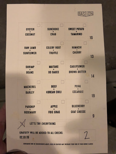 Start to finish, an absolutely delightful experience. From the unique space and menu to the attentive and engaging staff -- including those preparing the dishes -- Bastion provides an immersive experience that is ideal for special occasions. We celebrated an early anniversary there and enjoyed one of the best meals weve ever had. Highly recommended!