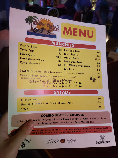 The coolest little biker bar youll ever visit. For all you non riders, dont be afraid. This is the friendliest place youll ever step foot in. Burgers, sandwiches, pulled BBQ, and chicken fingers for those in a hurry. If your planning on a meal, Monday is free pizza and Texas hold em, Tuesday is free lasagna, Wed is steak night, Thursday is Ribs and Chicken and a 3-ball tournament. Bands on the weekends. And a ton of bike parking. A unique bar and experience.