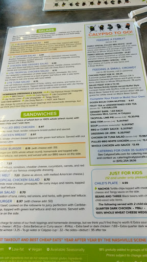 Couva Calypso or The Calypso Café @ 100 Oaks was a surprisingly nice experience. Its an trendy, Central American/Carribean island-esque themed restaurant with an emphasis on healthy, vegetarian, and vegan meals at an affordable price point. Now when I said "themed", I dont mean like the Rainforest Cafe or Aquarium Restaurant in the Opry Mills Mall; there arent any pictures of Castro shaking Che Guevaras hand nor any "props" of beached derelict row boats but they do play some interesting music. The music sounded a lot like some "Musica Latina", Dancehall, and possibly some classic Kingston Reggae...but the atmosphere isnt the most important thing here, its of course...the food. The food is so good here. The menu is easy to read with "V" marking vegan and/or vegetarian entrées and their website backs up these claims of a healthy menu; using "buzz words" like "low carbs, Trans-Fat, and no MSG or Gluten" and I have to say that Im convinced that most of their food isnt processed with preservatives. I had an all white meat Half-Chicken "Rotisseried" with Jamaican Curry seasoning (which was like an apple sauce with onions and spices), Boija Muffins, and a Mug of Soup. My wife had a similar dish and we also had the Cuban Black Bean Dip as an appetizer...it ALL was good...and that damn Fruit Tea "you must try this"!!! This place is definitely "a happening scene" for the hipster crowd but when night fell, all types of people came to eat there so no one should feel uncomfortable going here.My only dislikes were the tortilla chips (they just seemed too cheap) and the chairs were a little stiff (Im a big man so I like to have room to be comfortable). While I cant say for sure about the other locations, I recommend this one at 100 Oaks and I look forward to trying something else on the menu next time we are shopping in the area. Maybe Ill try a burger.....