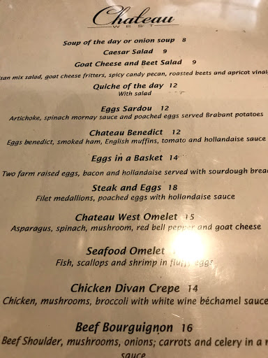 Thanks to the staff and Chef at Chateau West for an excellent dinner last night. I got a taste of my wifes scallops in lobster bisque sauce served over sauted polenta. It was delicious, but I was still glad that I selected the Coq au Vin. Bravo, Chef! I think it is a model correct chicken in wine, but there is no way to adequately describe it, except to order the dish. I cook a little French cuisine now and then and this Coq au Vin was exquisite. You cant get a spoonful from your dinner partner and properly appreciate the whole entree. The sauce (gravy) was not heavy, but the flavor was rich and complex. The vegetables basically reduced except for the potatoes, which were intact and great in the dish. I saw another review raving about the beef bourguignon. I have eaten it and it is excellent, but the Coq au Vin is better and more subtle. I think it is more difficult to prepare. I cook a Coq au Vin Rouge and it is NOT subtle. Thanks for superb dining experience.