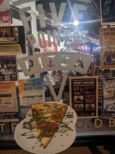 We have loved trying several places in the 5 points area, and this place does not disappoint either. They have a great macro craft beer selection, including a couple rotating taps by local craft breweries. Be sure to get the garlic knots (see pics)! Full order is almost enough to fill up the tank for a family of four, but dont stop there, because their pizza is amazing. Just crisp enough to allow it to be easily hand-held, but still tender. They use very high quality toppings and our T-Rex was very satisfying. The huge and delicious pizza was $25, my beer (brewed just down the street) was only $6, and the (8) large garlic knots with a side of marinara was only $6. Even after parking, this is quite affordable! Parking was easy, convenient, and affordable at only $5 for 2-hours in the lot directly behind the restaurant. Theres also a gourmet homemade ice cream shop just up the street, if youre looking for some dessert after your meal.