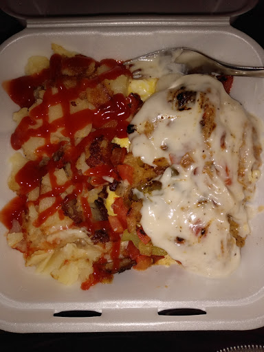 Mean hateful waitress.. really, we went to this place at 3am, as a tourist, unfamiliar with all the rules apparently, because my friend had 1 inch of a drink left in his to go cup and after waiting for a table for just 5 or so minutes and putting money in their silly video gaming machine, a mean, horrible lady waitress came and said to my friend " you cant have that in here " so I really thought she wanted it gone so I drank it like a shot because I really thought she wanted the drink gone, not us, it was an inch of watered down jamenson and Coke. To me it made perfect sense, then the bitter, heinous waitress that apparently doesnt like people having fun told me she "didnt like my smirk" and I was "out of here" so we looked super surprised because really we are nice normal people, we werent being loud or stupid or drunk acting like others there were. But the waitress really seemed to not like us for no real reason so we went else where and they liked us and our tips quite a lot.
