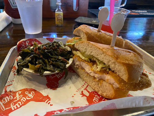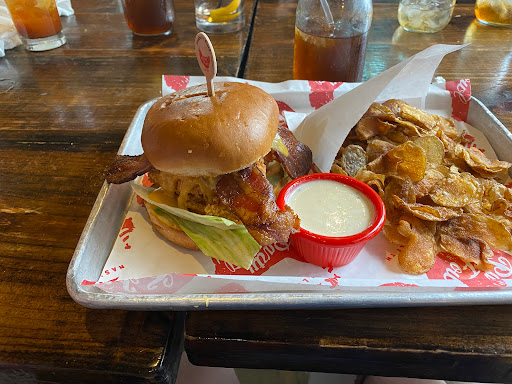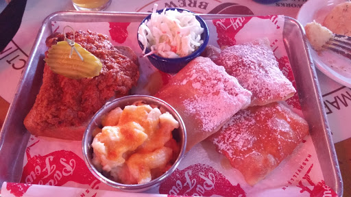 I wanted to try some hot chicken while I was in Nashville and unfortunately, I didnt find out that Hattie Bs closed at 4 pm until after the fact. So I yelped hot chicken and Party Fowl was one of the places that came up. It also happened to be semi-near the next location we needed to be at, so we decided to stop here for a quick dinner. Reservations are very important (not sure if its a Nashville or Tennessee or just a Party Fowl thing). My three friends and I showed up at around 6 and the place was half empty. Even so, they wouldnt seat because apparently, the whole restaurant was already reserved. So we ended up sitting by the bar, which was fine, since we were in a time crunch. I was planning to order their hot chicken, but seeing as I was hungover the entire day, Im not sure if I could have stomached that half a chicken. So I ended up getting the deconstructed cobb salad (Chopped romaine with tomato, cucumber, bacon, blue cheese, smoked hard-boiled eggs, avocado and hot chicken ). In fact, all four of us ordered that. You can pick your hotness level - grilled, southern fried, mild, medium, hot, Poultrygeist. I went with mild and there was barely any spice to it. Not complaining though, because Id rather have it be not spicy enough, than too spicy. The flavor of the chicken was good but it was dry. Im not sure if chicken breast is just not their specialty - maybe it was my own fault and I should have went with that half a chicken. I also wasnt a fan of the smoked egg. But this isnt Party Fowls fault - I dont really like that smoked flavor in general. Not sure I would be back but other than that deconstructed cobb salad, it seems like a nice place to grab a few beers and watch some sports.