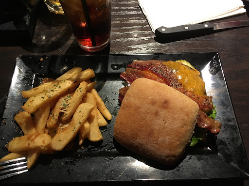 While this place is in a great location and during peak times the service and speed of the place is terrible. Fifteen to twenty minute wait the door as I walked in so I sat at the bar, the bartender was nice. Speed of the location between the orders and the kitchen was terrible. It was double the wait time at the door. The place slightly dirty and could have been better. Overall decent place, but speed and cleanliness are the big issues here.