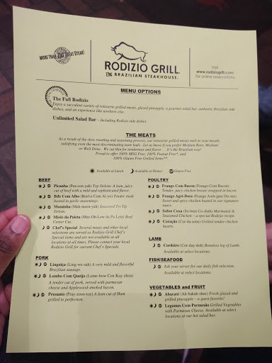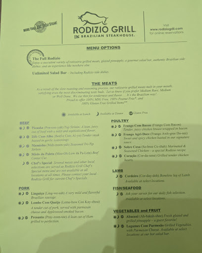 I went to Rodizios for the first time yesterday with my husband and two friends. It was fantastic. Once we were seated, we were immediately greeted by our server Mackenzie who explained how everything worked and took our drink orders. The salad bar was great. It had all of the normal salad fixings on the cold side and enough options to make an entire meal on the hot side. There was pasta, two types of rice (the wild rice was delicious) and even a stew of some sort that I did not try. By the time I got back to the table, my drink was there waiting and the first gaucho was headed towards us with meat. Every piece of meat that came out was incredibly tasty. Even the fish and I dont normally go for seafood of any kind. At first I was skeptical of the small slivers of meat that they cut but then the guys just kept on coming and I realized the small slivers are the way to go. Not only does it help you pace yourself for trying everything but I imagine it also helps to limit the amount of food people waste by taking more than they can eat. I read some reviews that complained of the portions. I dont understand why anyone would complain when the guys come by your table over and over until you tell them to stop. The gauchos themselves were all great and joked around with us whenever they were at the table. Overall, it was a great experience. The server even offered a military discount when I gave her my USAA card. Well worth the $36.99 per person. We left incredibly full and satisfied. And will definitely be back.