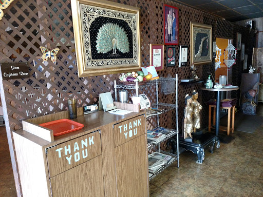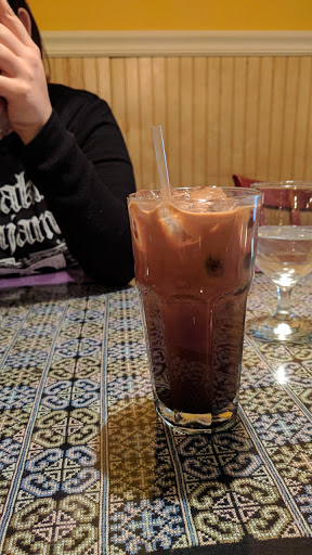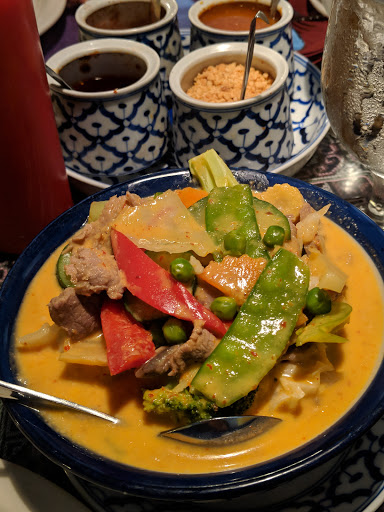 Went here with a friend for dinner and soon wished we hadnt. The duck curry I received was riddled with small, toothpick-sized broken bones that must have been cleaved before serving and rendered the entire dish inedible. The waitress only said that they were sorry, but didnt offer any resolution. In the pictures you see normal chair and table setups, but the area we were seated is in the back left of the restaurant and is what Id call benches with a communal back rest. If you leaned back at all, youre leaning against the person sitting behind you. Still confused with that one. On another note, the restroom I used before leaving was absolutely filthy and afforded a good view of the kitchen which also was dimly-lit and grungy. Probably a good thing I didnt eat more than a bite of my food. I guess at least our Thai teas were pretty great.