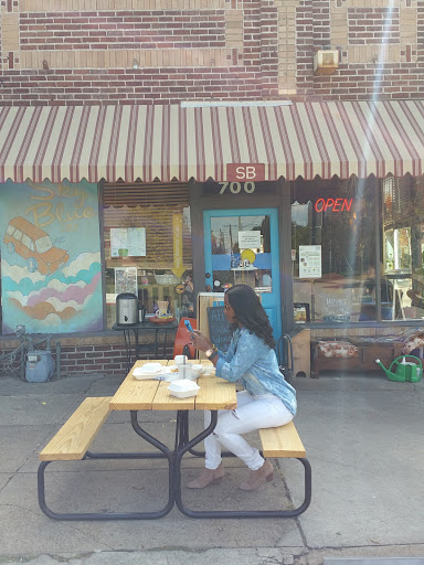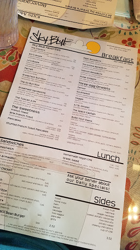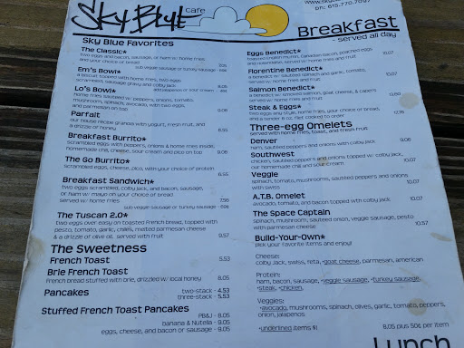 My first time going to Sky Blue Cafe was on a Saturday morning. I chose not to go in because of the long wait. The second time around I went on a Friday morning, we were seated after about 20 minutes. Once seated service was prompt and courteous. I had the Space Captain omelet with a decaf cappuccino. The coffee was mild and flavorful, the omelet was light and fluffy. It comes with a vegetarian sausage which has a flavor and texture I think any carnivore (such as myself) would enjoy. All in all it was a pleasant experience. I hope they expand their facilities because I imagine the long lines on weekends are driving many people away from a great meal (as was my first experience with Sky Blue).