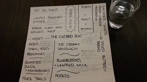 I would consider my fiancé and I to be foodies. We dont have any formal training or anything, but we have seen every episode of Top Chef. So doesnt that mean we are pretty much experts :D? Just kidding! But in all seriousness, we have had many tasting menus in our time (including Eleven Madison Park) and I honestly have to say in terms of overall experience and taste, this is the BEST tasting menu we have ever had. I think it definitely comes down to personal preference in some regard but it was just incredible. Every dish was absolutely flawless. Also, my partner doesnt drink so the fact that they offer a non-alcoholic pairing option was awesome! Everything was so thoughtful. If you are in Nasvhille, either because you live here or are visiting, I cannot recommend the Catbird Seat enough. Go go go!