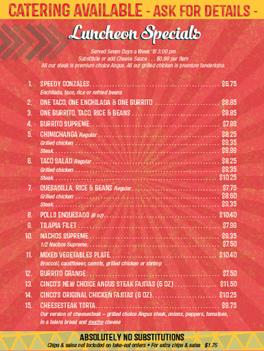 My wife and I went to Cinco de Mayo on a busy Friday night. We waited over 40 minutes to have our orders taken. Then another 30 minutes for our food. When it did come out, it was relatively burnt/dry, and unseasoned. We also feel like we got a paltry serving portion, and very poor service. Water glasses stayed empty the whole time. Chips were very dry and stale. They also said they dont have drink specials. We have been to the Cinco de Mayo in Brentwood MANY times, received excellent service, food, and drinks, and will return there if we wish to frequent a CDM in the future.